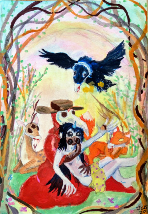 J. Gonzalez-Blitz is a multi-disciplined artist who creates paintings, drawings, comics and illustrations. She makes music as a vocalist and by creating experimental soundscapes electronically. She is trying to teach herself violin. She practices butoh and incorporates it into her performances. J. was born in Hell's Kitchen, NYC to Cuban and Irish parents who grew up on the same block. Diagnosed with schizo-affective disorder, she says it's her drummer husband, rats, knives, Bustelo and Malta that keep her fired up to fight.