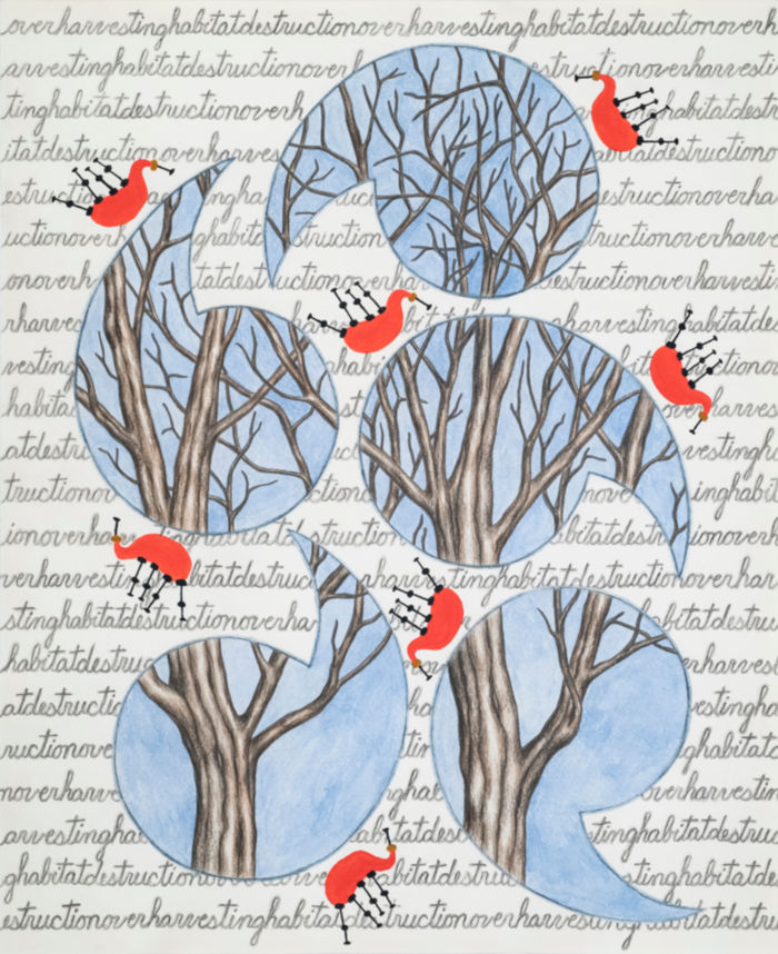 "I create works about nature as it succumbs to climate change, a cause and symptom of our society's turmoil and greed. 'The Green of the Globe is Disappearing,' a series on 5 endangered trees, blends a Western sensibility with influences of Eastern art and the immediacy of graphic design. Each shows the brown, dying trees reflected in precious droplets of water, surrounded by words and icons expressing the causes of their decline. The inspiration came from a hike in nature, my first during the pandemic, timed with news of the devastating wild fires. Many trees around the world face extinction as we decimate our forests and water becomes an ever more finite resource."