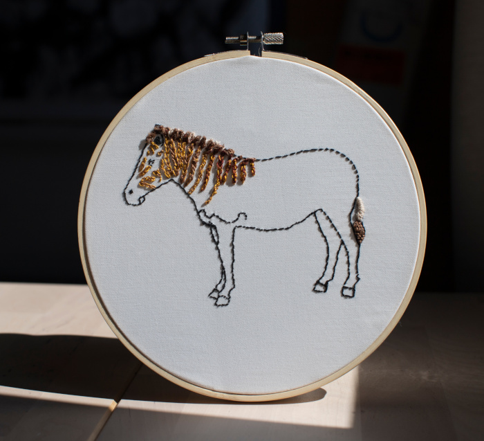 "These hand-embroidered works document recently extinct animals on pieces of recycled bed sheets. The making process is slow, careful and therapeutic, contrasting the physical violence and relative speed with which these species were driven to extinction.