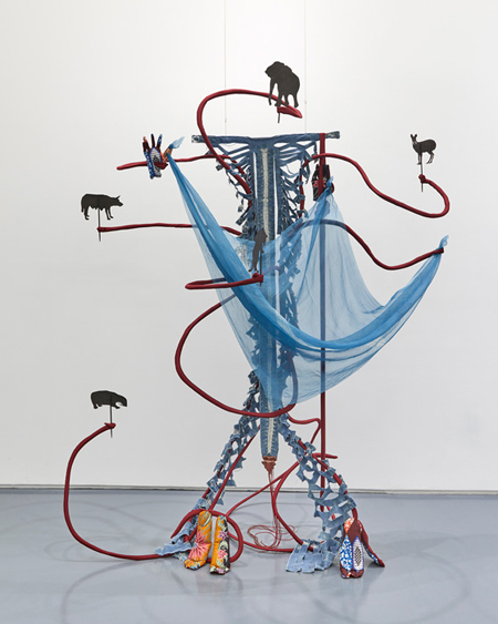 Animal Medicine, 2020, Indigo on cotton and silk organza, Indonesian batik print and Dutch wax cloth, spandex, sumi ink on paper and wood, wax, metal, and thread, 84 x 60 x 24 inches