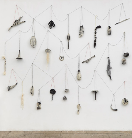 What Came Before, 2019, merino wool, mohair/silk yarn, linen thread, nails, 12' x 12' x 10"
